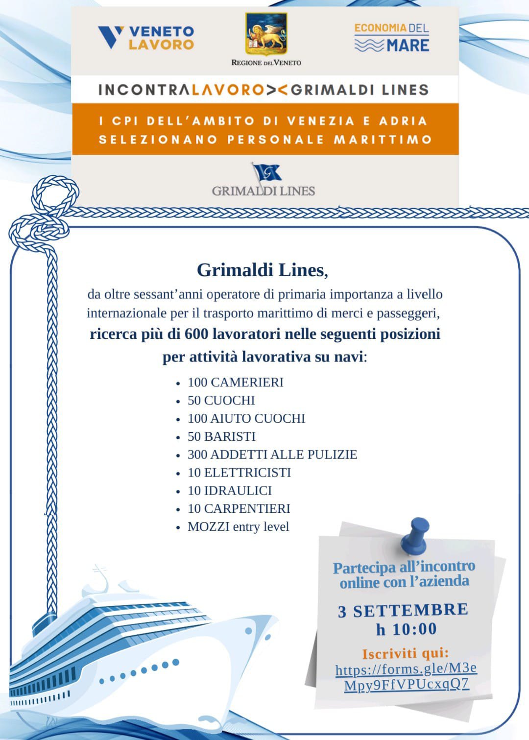 Il 3 settembre incontro on line con Grimaldi Lines per l'assunzione di 630 lavoratori.Durante l'incontro saranno illustrati i requisiti in vista dei colloqui in presenza presso il CPI di Chioggia. Iscriversi al seguente link: https://forms.gle/M3eMpy9FfVPUcxqQ7
